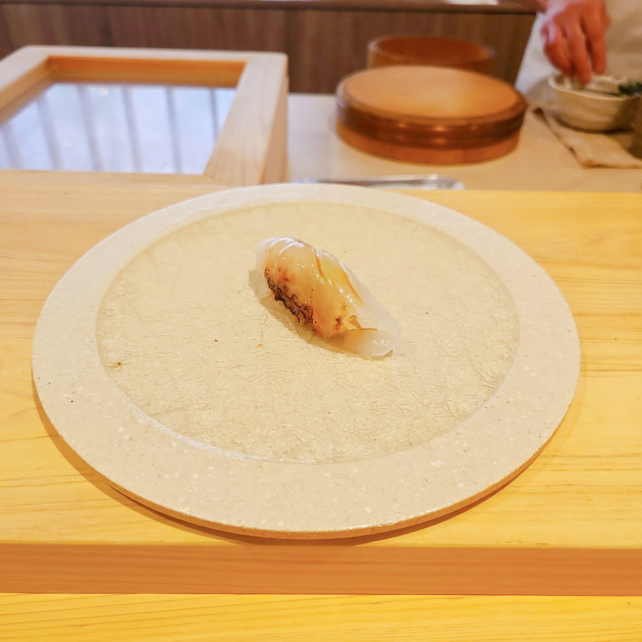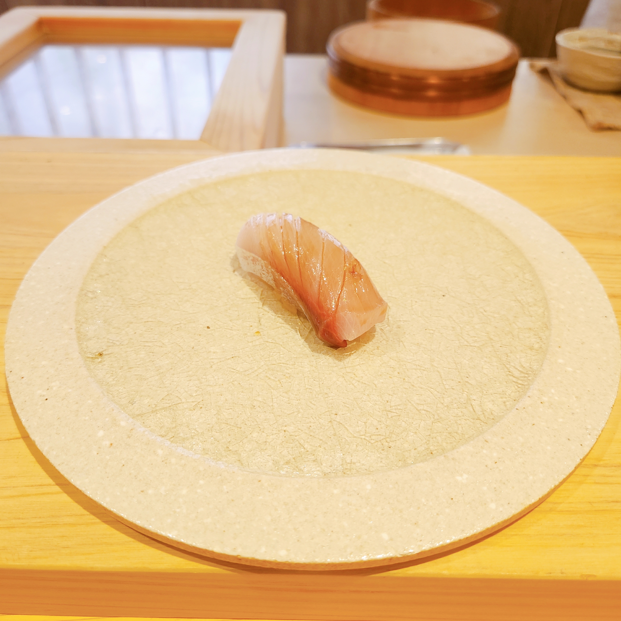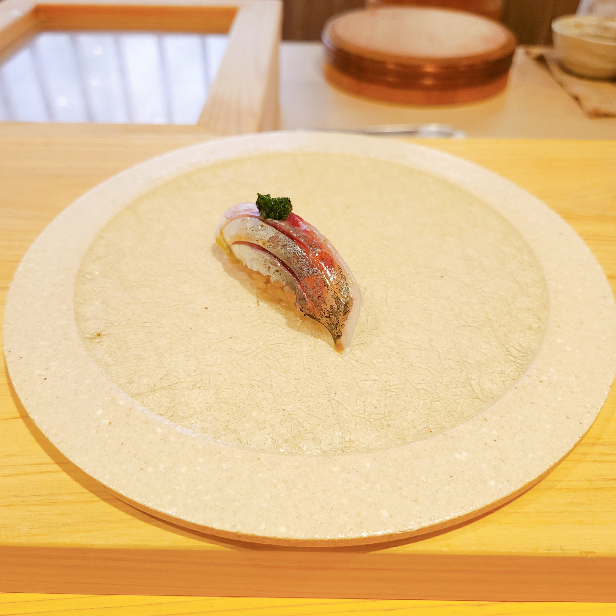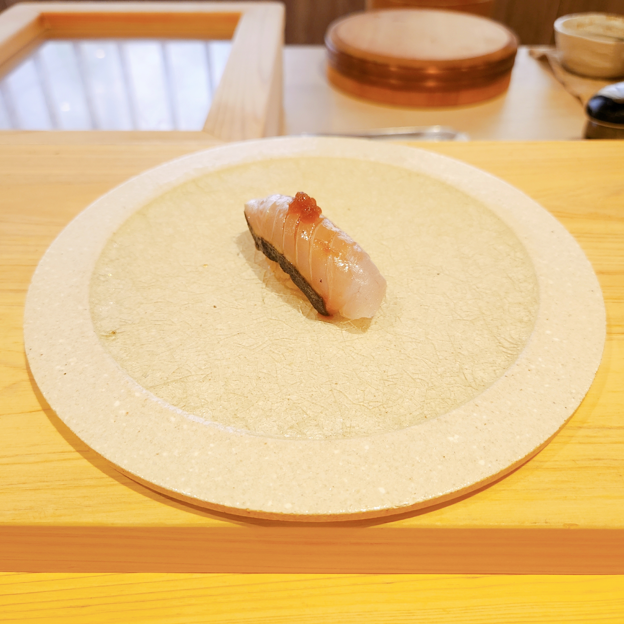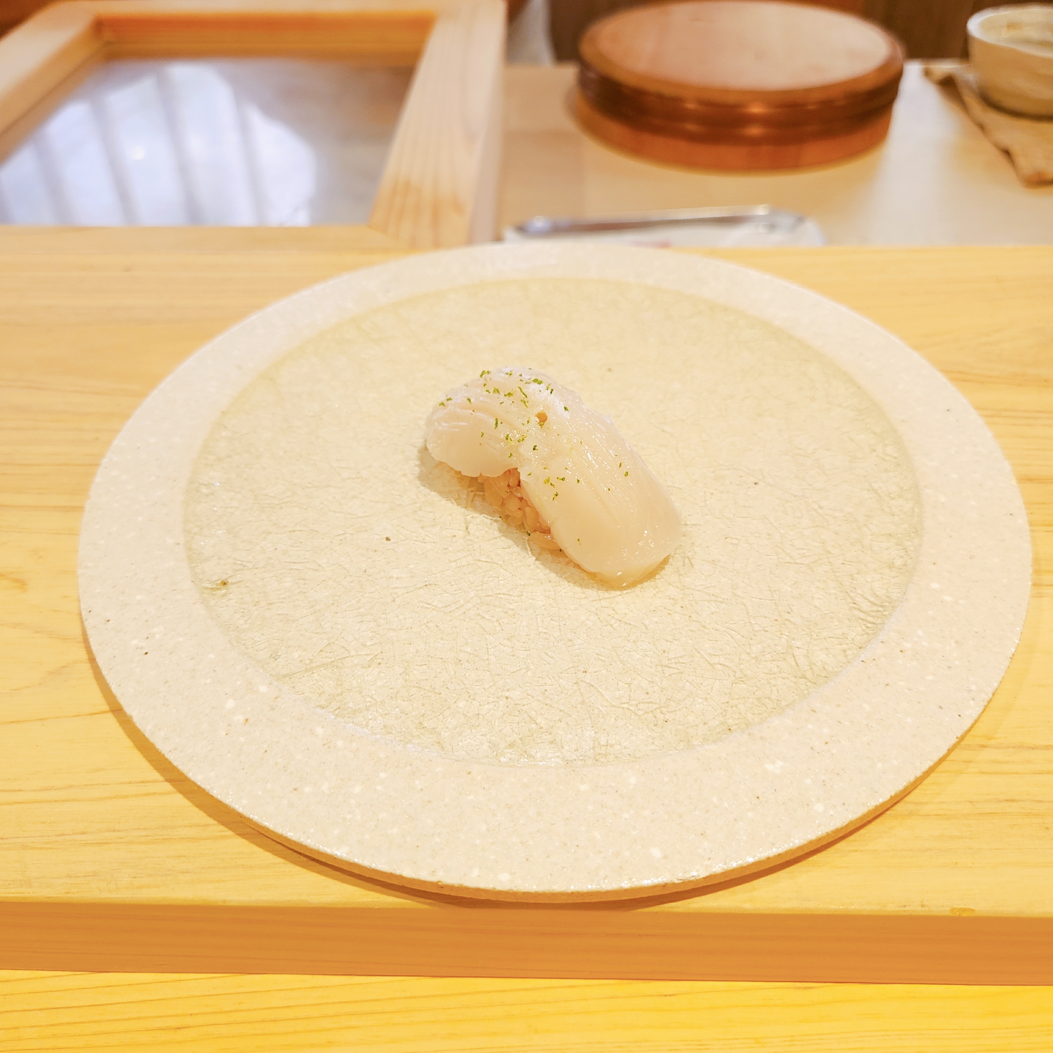 이어 ‘도미 스시’, ‘방어’, 그리고 ‘전갱이 with 시소’와 같이 각 재료 본연의 맛을 살린 요리들이 연달아 제공되었으며, 청귤껍질 가루가 뿌려진 ‘관자’와 볏짚에 훈연한 ‘삼치’는 특히 인상 깊었습니다.