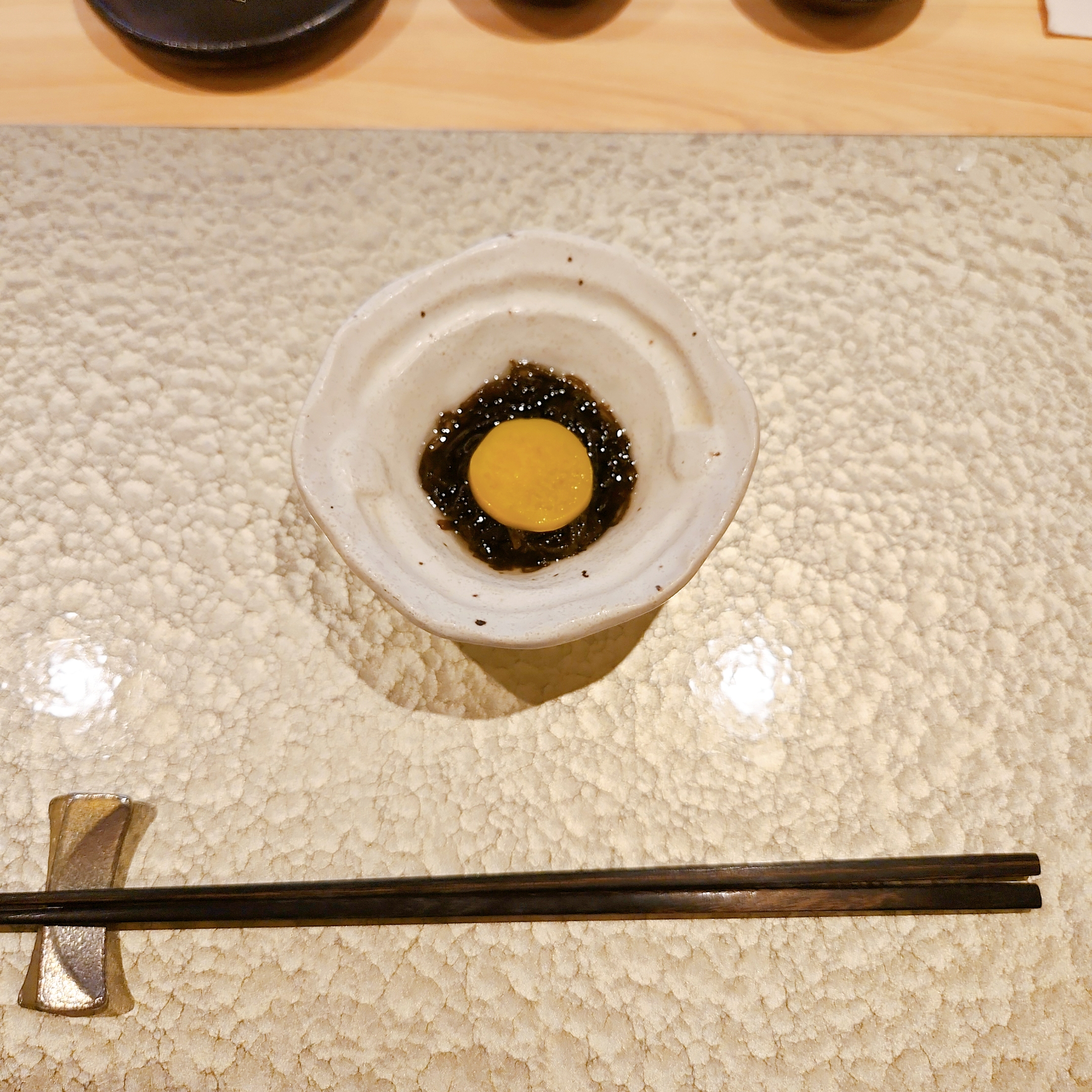 첫 번째 메뉴인 ‘자완무시’부터 시작하여, 상콤한 해초국수 느낌의 ‘오징어 청어알&큰실말’, 1일과 3일 숙성된 도미 사시미 등 신선한 재료의 맛을 차례차례 즐길 수 있었습니다.