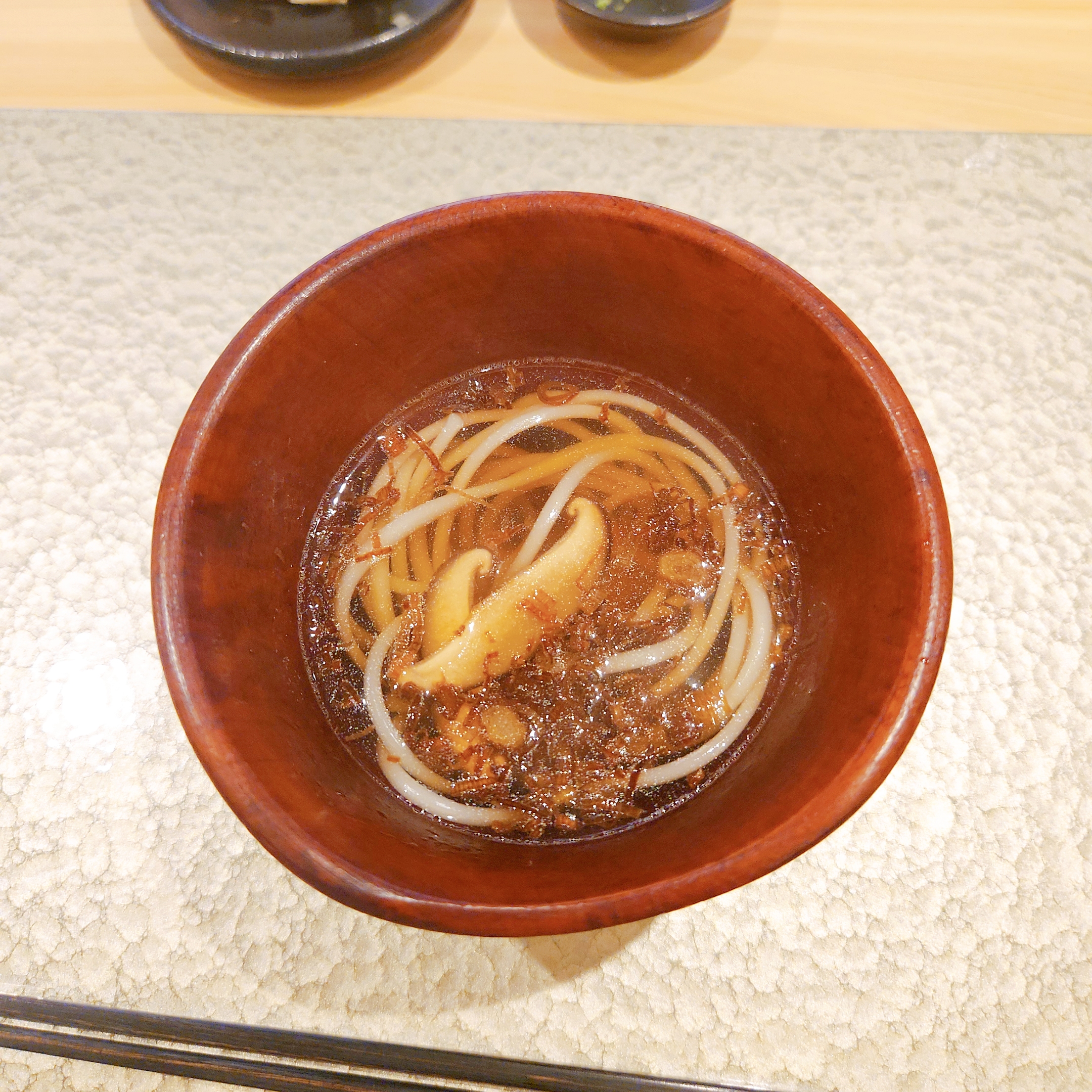 식사의 마무리로는 향긋한 국물의 우동과 교쿠, 달콤한 마카다미아 아이스크림으로 입가심을 하며, 전체적으로 만족스러운 오마카세 경험을 하게 되었습니다.
