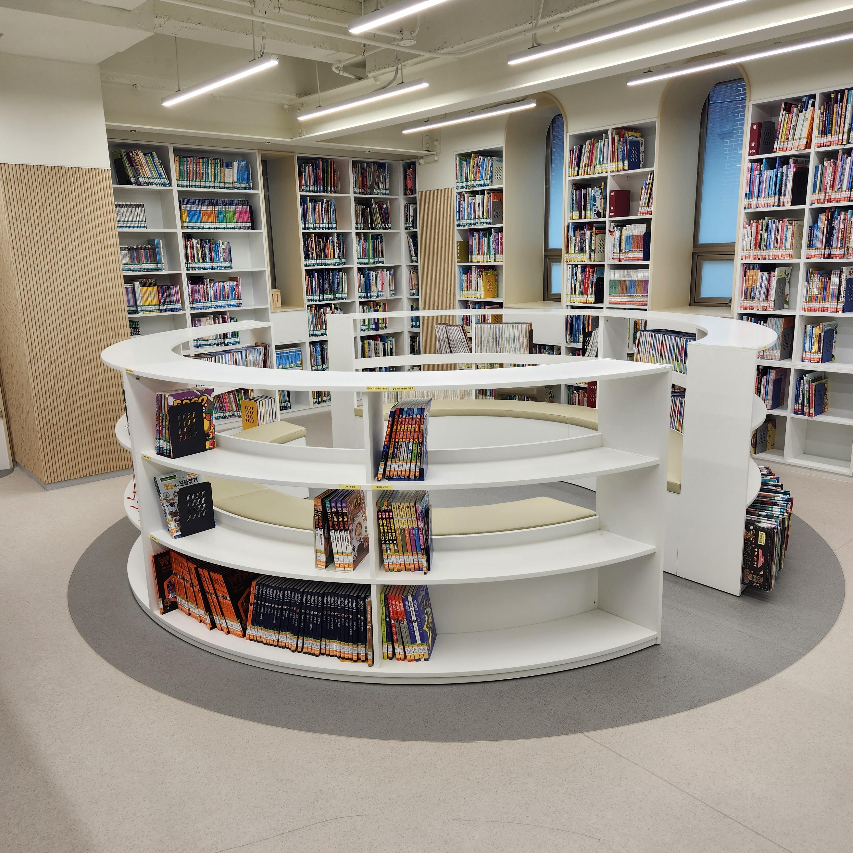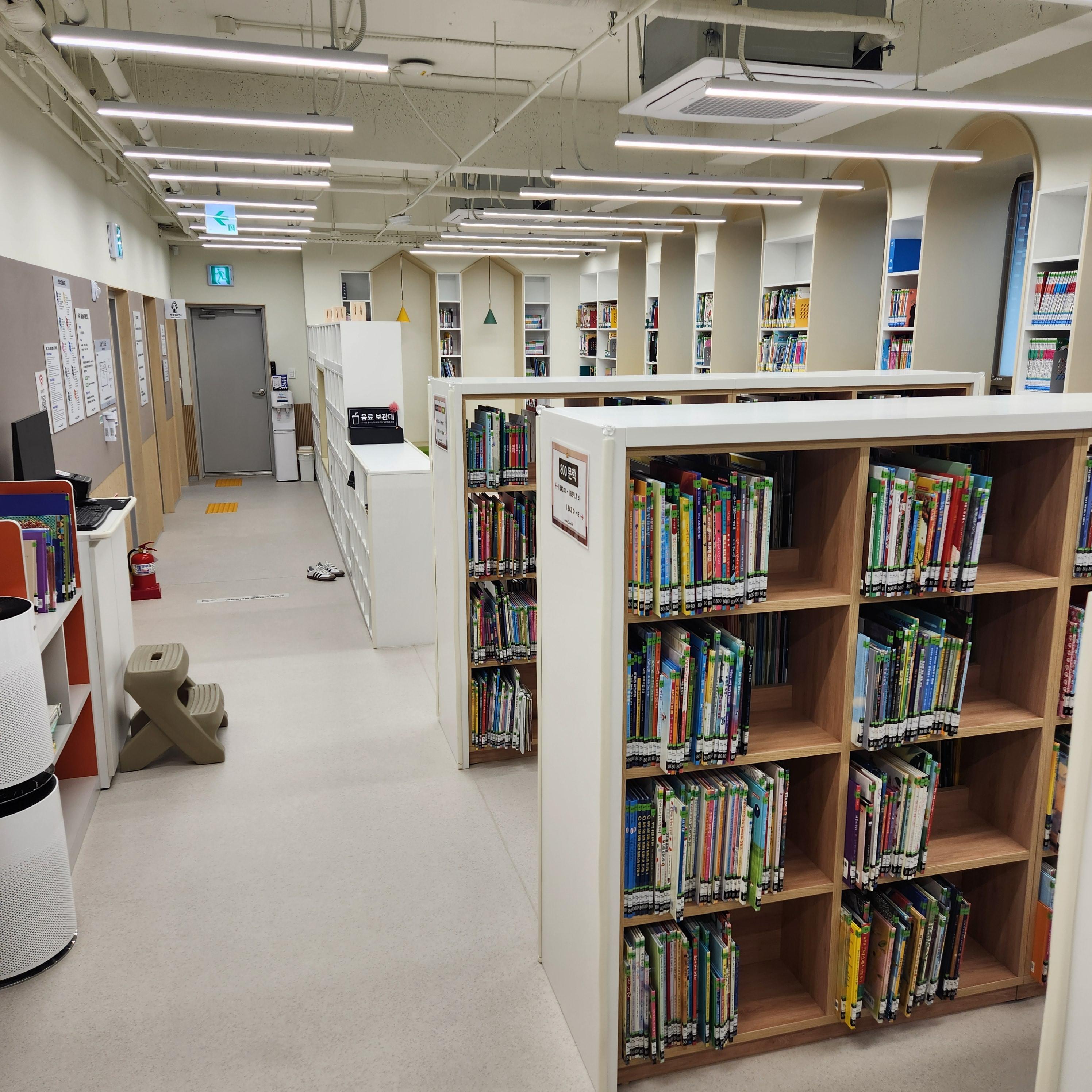 책장 높이도 아이 키에 맞춰져 있고, 앉아서 책을 펼칠 수 있는 아늑한 코너들이 다양하게 준비되어 있어, “도서관이 편안하다”는 느낌을 아이들이 자연스럽게 받을 수 있도록 돕고 있습니다.