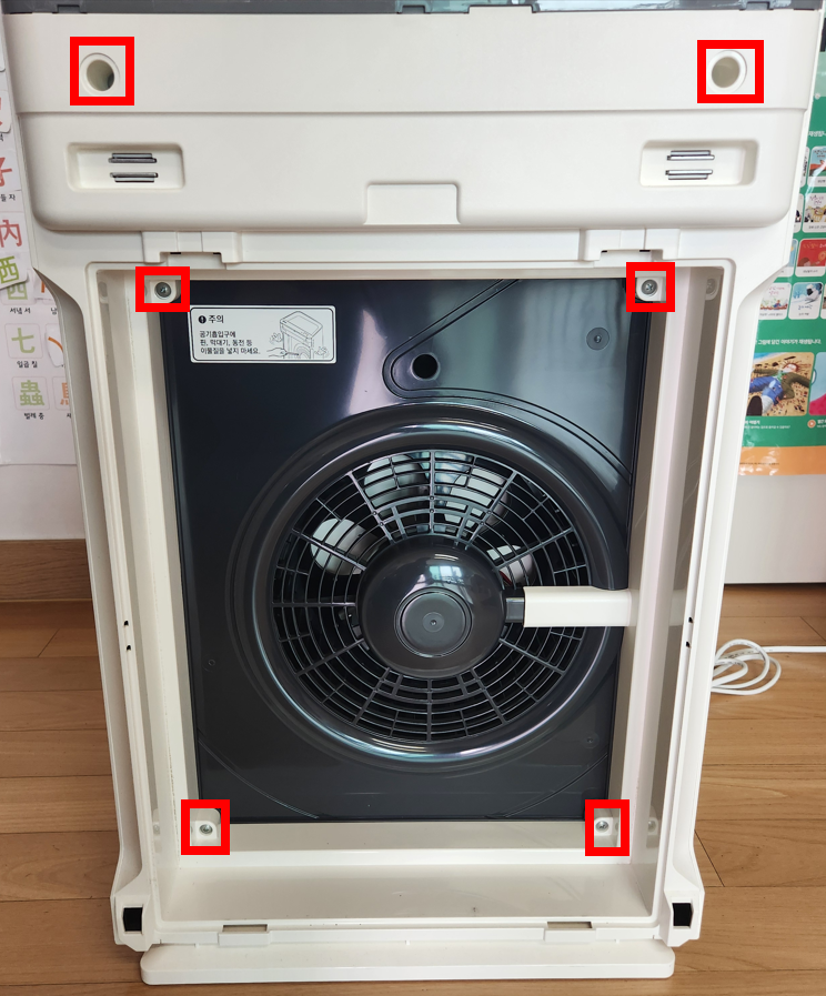 ⑦ 공청기 뒷 부분의 나사 2개를 풀어줍니다. 그 다음 팬이 붙어 있는 검은색 키트를 앞면으로 분리시킵니다. 톡톡 치면서 분리하면 되어요:)