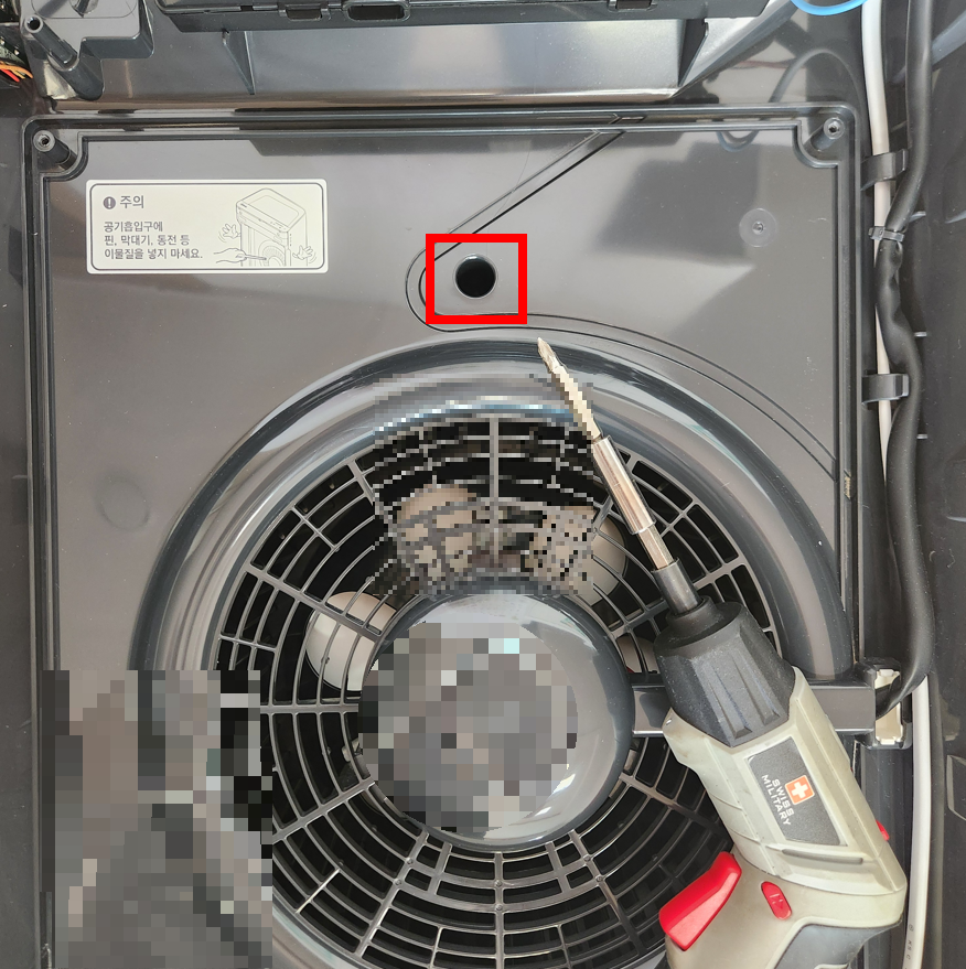 ⑥ 팬 바로 위에 있는 나사 하나를 풉니다. 깊숙히 있어서 좀 기다란 드라이버가 필요해요.