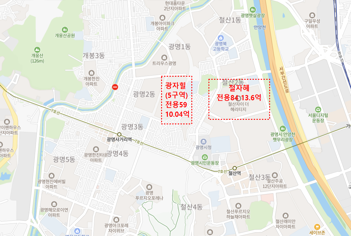 두 단지 모두 광명사거리역, 철산역 등 교통 편의성과 학군, 생활 인프라가 좋은 위치에 자리해 있으며, 최근 광명 뉴타운 개발과 철산동 재건축에 대한 기대감으로 인해 매매가가 강세를 보이고 있습니다.