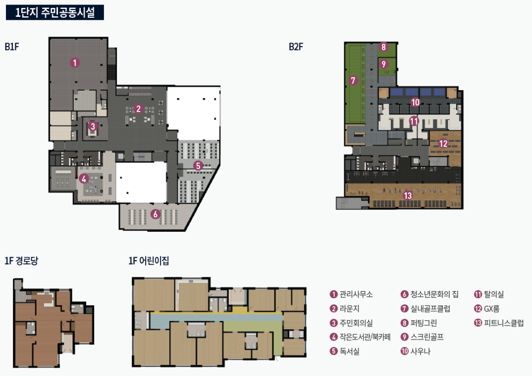 - 생활 편의시설(상업시설, 키즈존, 주민운동시설 등)이 단지 내에서 해결 가능