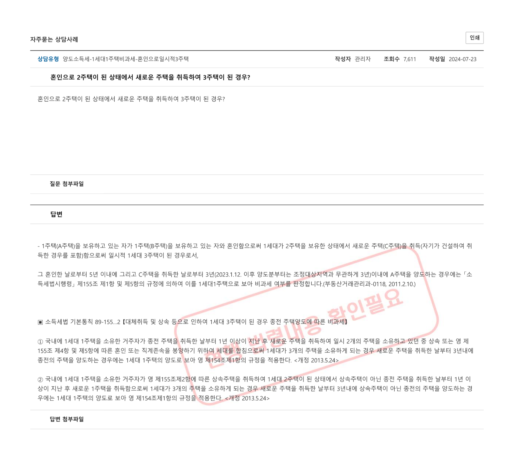 혼인 외에도 상속이나 증여, 또는 직계존속과의 세대 합가 등으로 인해 일시적으로 3주택이 되는 경우도 있습니다. 이럴 때 역시 유사한 ‘3년 이내 양도’ 기준이 적용되는데요, 단 상황에 따라 적용 조항이 다르기 때문에 혼인의 경우에는 ‘소득세법 시행령 제155조 제1항 및 제5항’을 적용받는다는 점을 기억하셔야 해요.
