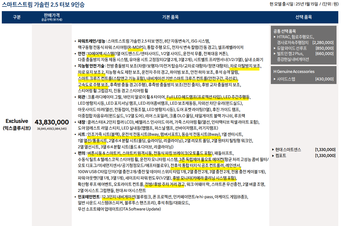 사실 익스클루시브 트림에도 웬만한 거 기본적으로 필요한 건 다 들어가 있습니다.