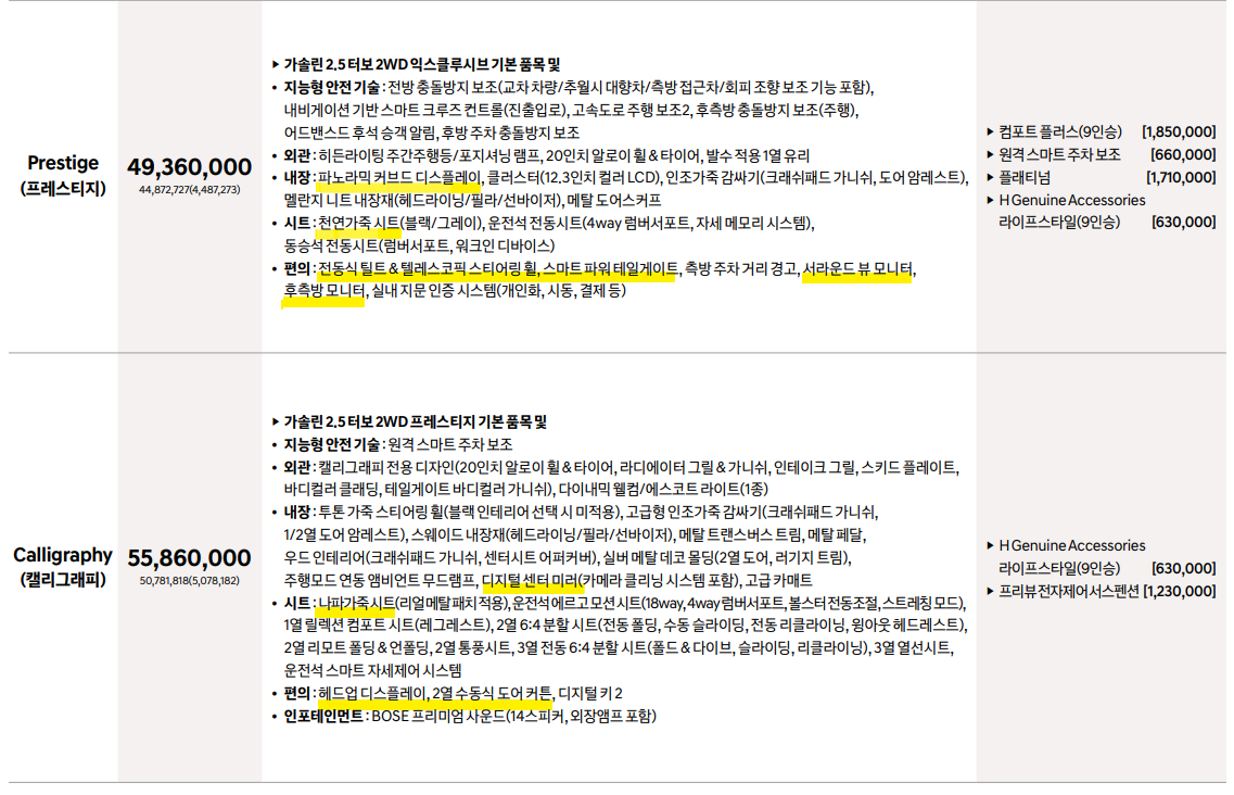 → 프레스티지 옵션들은 필요한 게 많네요. 프레스티지 정도는 사야 팰리세이드 탄다고 할 수 있겠습니다!